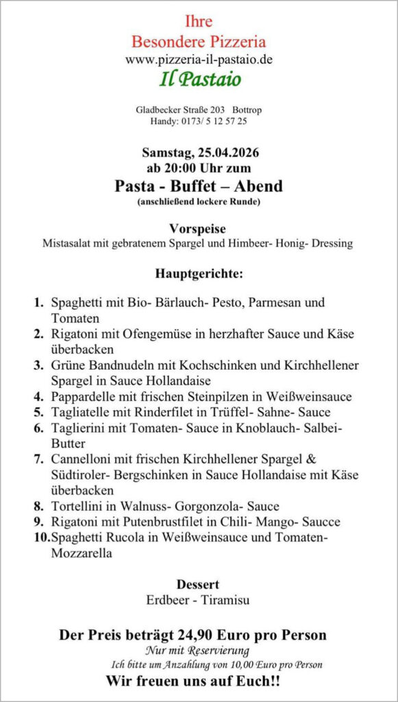am Samstag, dem 25.04.2026 um 20.00 Uhr, veranstalten wir in unserem Restaurant einen "PASTA-BUFFET-ABEND".